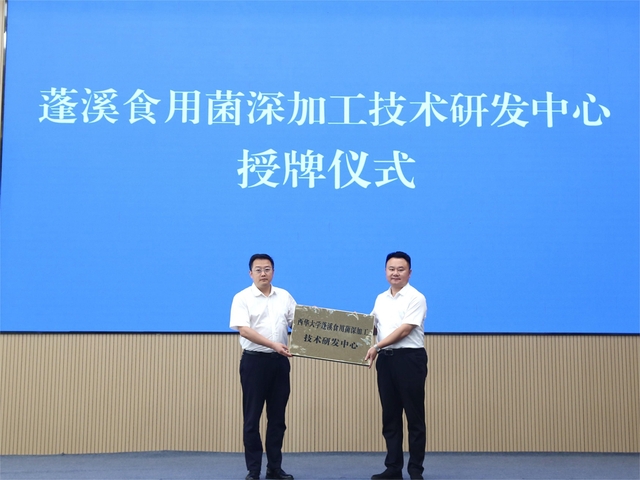 8月14日,校党委书记刘树根、副校长郎方年带队,携党委组织部、党委宣传部、科学技术与人文社科处、食品与生物工程学院负责人及相关人员前往遂宁市蓬溪县,开展校地合作调研,举行Beat365唯一官方网站蓬溪食用菌深加工技术研发中心授牌仪式。