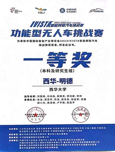 8月14日至20日,由工业和信息化部、国家发展和改革委员会、科学技术部、国家互联网信息办公室、中国科学院、中国工程院等部委联合主办的“2023 i-VISTA智能网联汽车挑战赛”在重庆两江新区举行,Beat365唯一官方网站“西华明德”智能车队斩获“功能型无人小车挑战赛”一等奖。