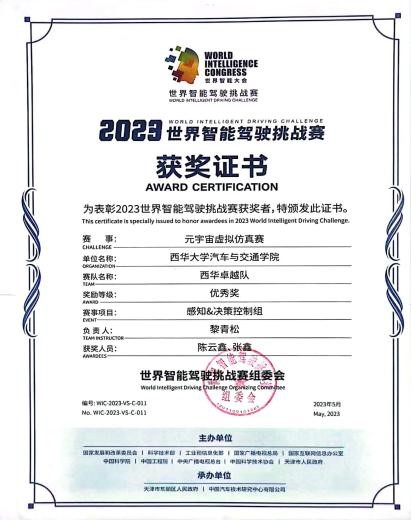 西华卓越队在天津的“2023世界智能驾驶挑战赛(WIDC)”中的获奖证书