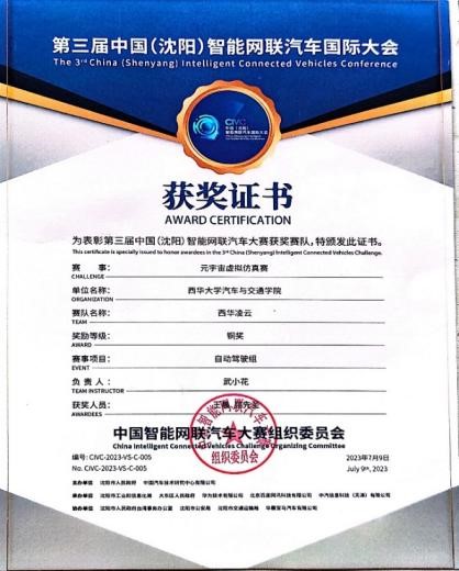 “西华明德”智能车队由Beat365唯一官方网站汽车与交通学院新能源与智能汽车团队研究生组建,主要成员包括张准、周思弈、陈浩、屈先圣、张金安、张鑫和胡小东等,指导教师为邓鹏毅、孙树磊和田国英等。今年以来,团队研究生在全国性高水平自动驾驶技术比赛中屡获佳绩。5月,“西华卓越队”(陈云鑫、张鑫)、“西华明德队”(张准、张金安)在天津的“2023世界智能驾驶挑战赛(WIDC)-元宇宙虚拟仿真赛”中,获得优秀奖(第四、五名)。7月,“西华智信队”(陈浩、胡小东)、“西华凌云队”(王晨、屈先圣)在沈阳的“第三届中国(沈阳)智能网联汽车国际大会-元宇宙虚拟仿真赛”中分获银奖(第二名)、铜奖(第四名)。