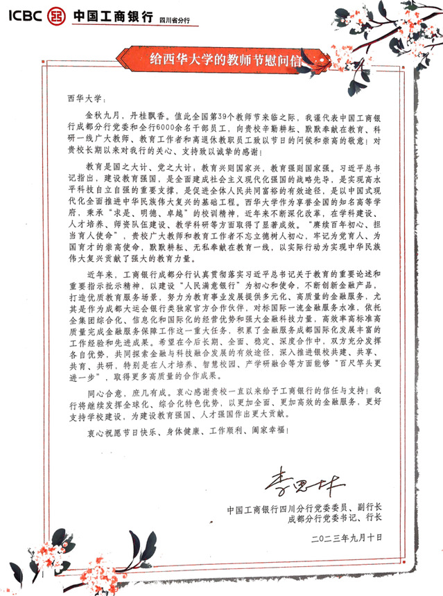 黄国骊代表成都分行向全校奋斗在教书育人一线的教师和教育工作者致以节日的祝福和诚挚的问候,向学校多年来对工商银行的支持表示感谢。他指出,近年来,工行紧紧围绕国家重大战略决策部署,奋力做好各项工作。作为工行的战略合作伙伴,希望学校多给银行提宝贵意见,工行将一如既往地围绕学校特色和需求,集中资源,更加深入到教职工的生活和工作中,提供更优质的金融服务,助力双方事业发展。