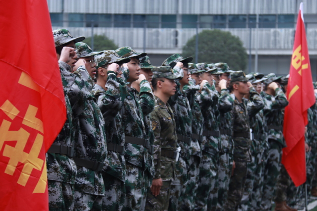 新生们统一身着军装,精神抖擞、器宇轩昂,列成整齐方阵,在庄严的国歌声中军训开训仪式正式开始。