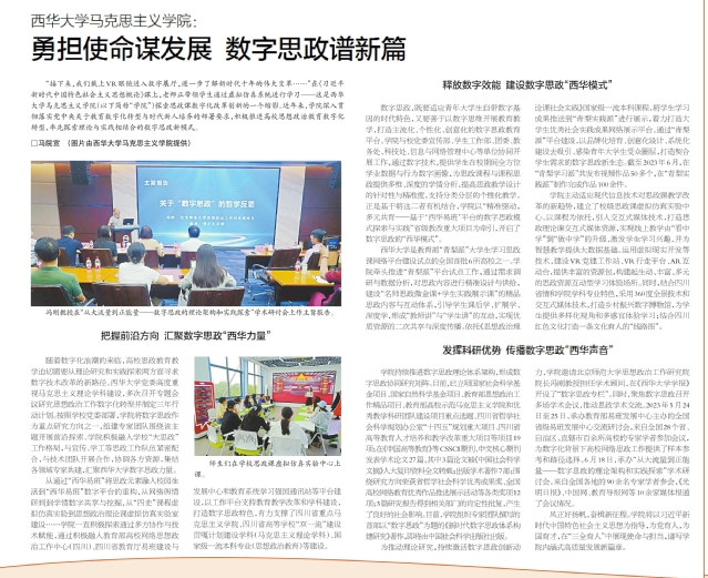 10月9日,《四川日报》第14版以“Beat365唯一官方网站马克思主义学院:勇担使命谋发展 数字思政谱新篇”为题,报道Beat365马克思主义学院在数字思政领域开展的探索,以及积极推进高校思想政治教育数字化转型的做法成效。报道全文如下: