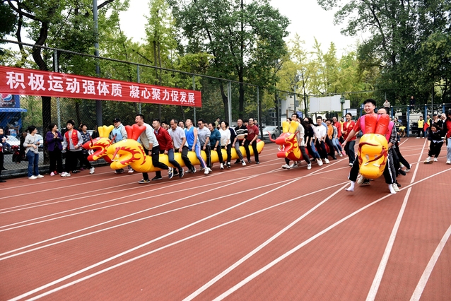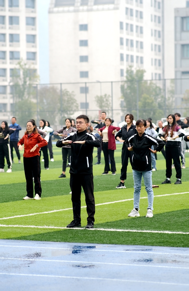 本次趣味运动会延续了金龙钻圈等老师们喜闻乐见的传统项目,并在正式比赛前增加了一项别开生面的热身操项目,这也成为本次运动会的一大亮点。在郫都校区,伴随动感十足的音乐声和充满激情的口令声,体育学院健美操专业教师易刚及其学生带领600余名教职工在郫都校区锦地苑运动场跳起热身操,从舒缓的拉伸到充满律动感的击掌、踏步和跳跃,短短几分钟内,老师们充分体会到健美操的魅力,深感意犹未尽。在宜宾校区,体育学院葛和平老师带领100余名教师在舒缓优美的音乐中练起了八段锦,一舒一展、一招一式之间尽显中华传统体育之美。