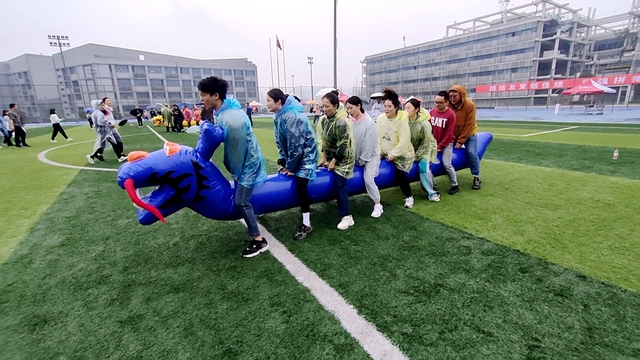 上午最后一个项目“陆地龙舟”更是掀起了比赛高潮,这也是本次比赛中难度最大的项目,既需要团队整体的配合默契度,也需要参赛队员个人具备较强的体能。在整齐的“左-右-左-右”号令声中,大家齐心协力、勇往直前、你追我赶,精彩不断,赢得了观众最热烈的掌声和欢呼声。