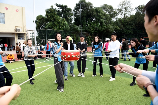 下午的比赛项目也各具特色,在和煦温暖的阳光中,老师们放下平时的工作压力,尽情享受运动带来的快乐。“趣味投篮”的瑜伽球在空中划出一道道漂亮的抛物线,“欢乐飞盘”一展老师们矫健的身姿,“迷你桌上保龄球”考验的是“手稳”和“心稳”…… “鼓动人心”是单项参赛人员最多的项目,1个队员将网球放到鼓上,16个队员拉紧鼓周边的绳索进行颠球,大家全神贯注紧盯着球,小心快速移动脚下步伐,只见那网球有节奏地上下跳动,发出“咚咚咚”的声响,奏出此刻最美的乐章。