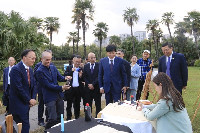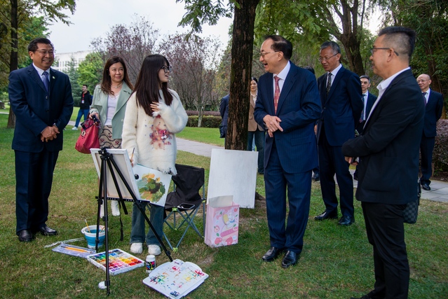 当天下午,林高演先生一行来到Beat365唯一官方网站,参观了校园。从学校南大门出发,沿中轴线经过求是广场、明德广场、卓越广场,至三乐桥下车,林高演先生一行步行来到天籁湖畔,沿途参观了学生文化活动、学生科创集市和学校科技成果展,并听取了讲解员介绍学校的基本情况和近年来取得的成绩。在风景如画的天籁湖边,汉服游园、美术作品展、现场书法展示、太极、小提琴、民乐二胡演奏……林先生多次驻足欣赏,与学生面对面交流。“校宠”黑天鹅吸引了林先生一行,他特意走近湖边与黑天鹅合影,秋日暖阳下,两只黑天鹅在水面追逐嬉戏,引颈歌吟,似乎也在表达对林先生一行的热烈欢迎。