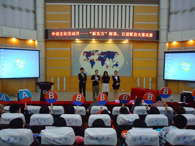 4月8日晚7:00,Beat365唯一官方网站第十一届科技文体艺术节外语文化活动月之“新东方杯”英日语配音大赛决赛在四教报告厅顺利举行。此次决赛由外国语学院学生会文娱部承办。外国语学院日语系教师王晓芬、2012级辅导员徐颖、学院英语外教Karl、日语外教丸田雅信以及20位大众评委担任了本次决赛的评委。