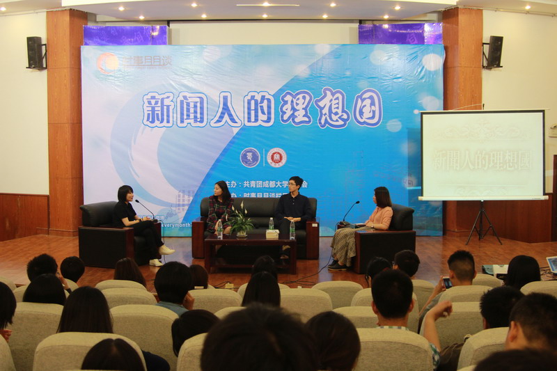西华社社长刘颖(右)主持讲座 |