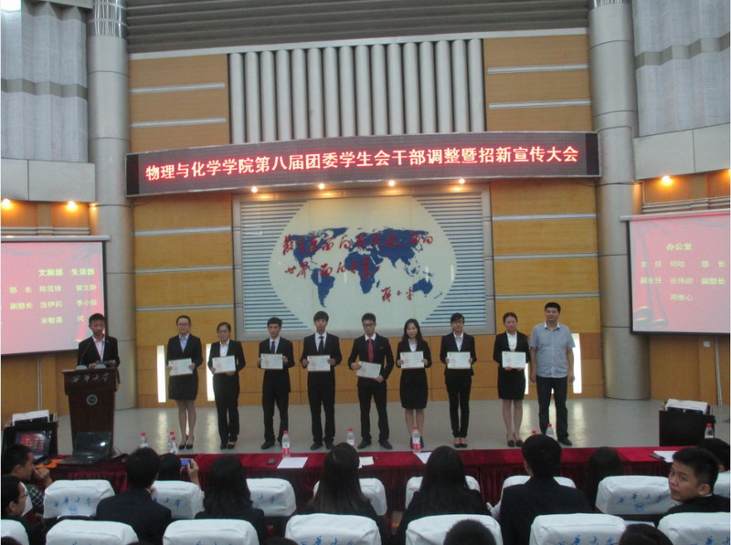 9月22日中午12:00,物理与化学学院团委学生会干部调整暨招新宣传大会在四教报告厅顺利举行。院党委副书记兼副院长李欣、团委书记刘伟、学工办主任杨玉强、学工办各位老师以及上届团委学生会主席团代表和2013级全体新生参加了此次大会。