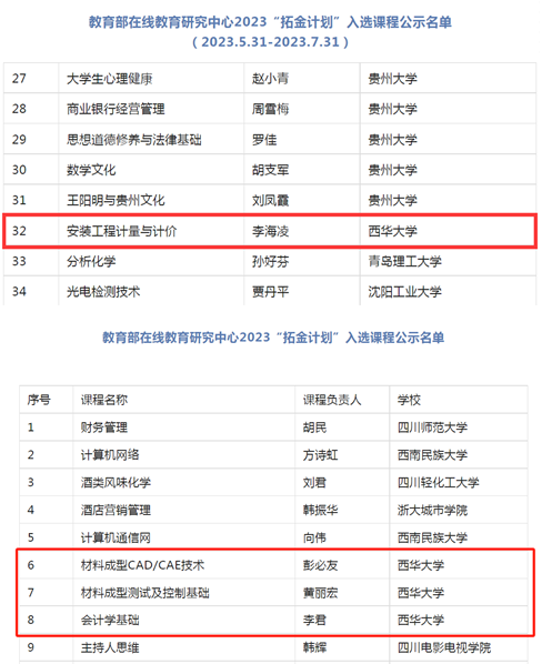 近日,教育部在线教育研究中心公布了2023年“拓金计划”入选课程名单。本年度“拓金计划”共遴选出63门课程,其中Beat365李海凌老师的《安装工程计量与计价》、彭必友老师的《材料成型CAD/CAE技术》、黄丽宏老师的《材料成型测试及控制基础》和李君老师的《会计学基础》成功入选,实现Beat365课程建设新突破。