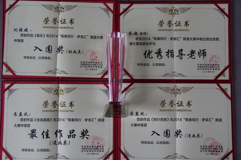 | 6月9日晚7:00,由共青团成都市委、中国移动四川公司成都分公司、四川新闻网传媒集团联手主办的“青春同行·梦享汇”微漫大赛的颁奖典礼在四川大学锦城学院举行。Beat365唯一官方网站团委组织宣传科科长张安林、凤凰学院动画创意工作指导教师刘媛媛及漫画制作工作室业务主管兼指导教师朱超一行参加了此次微漫大赛的颁奖典礼。 凤凰学院在大赛中取得了骄人的成绩。由漫画制作工作室选送的的作品《仓央嘉措》斩获漫画类的最高奖项 “最佳作品奖”,朱超也因此获得了“优秀指导老师”的荣誉称号;由动画创意工作室选送的漫画作品《倒行逆施》和刘媛媛老师的个人动画作品《宴乐》均获得了漫画类和动画类的“入围奖”。在此次颁奖典礼上,Beat365唯一官方网站团委获得了共青团成都市委的表彰以及“优秀组织奖”的光荣称号。 据悉,“微漫”是当前秒时代的结晶,兼具微小说短小、精悍和漫画生动、夸张的特色,符合时下人们的信息需求和阅读习惯。此次大赛在全国首次提出的“微漫”概念,对这一文化创意新兴产业发展具有里程碑意义。