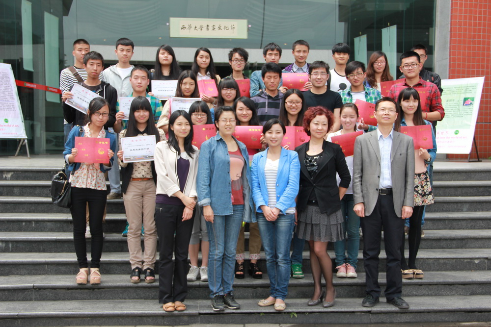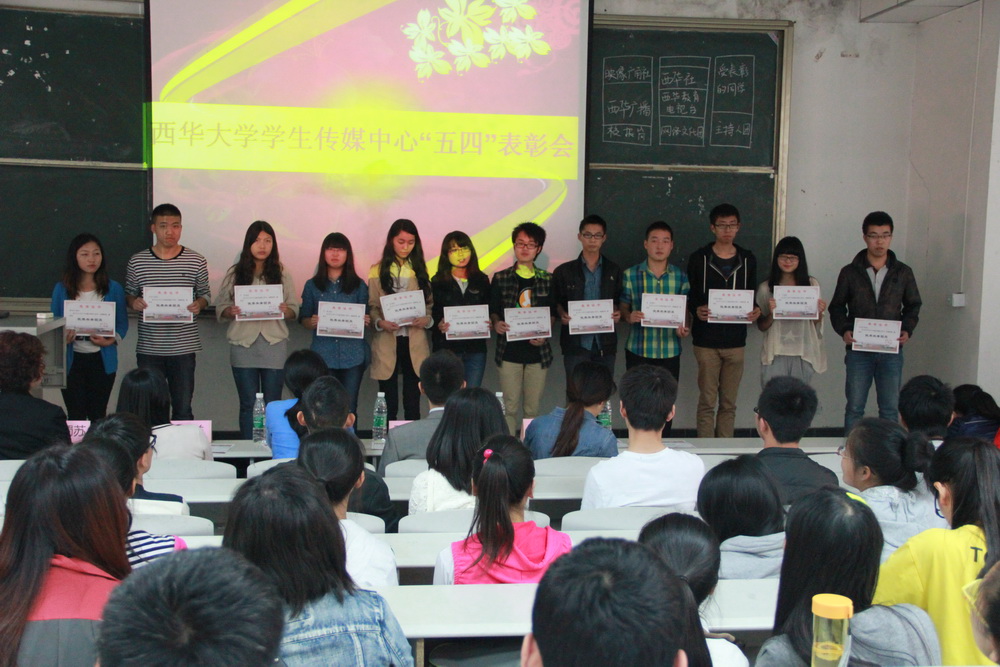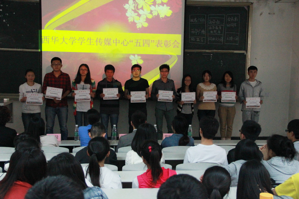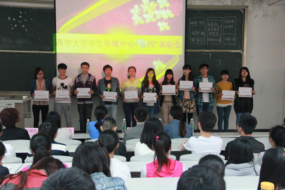5月9日中午12:40,党委宣传部学生传媒中心“五四”表彰大会在4A-104举行。党委宣传部副部长山述兰及部门老师,学生传媒中心西华社、广播台、电视台、广角社、主持人团、网络文化队等社团的同学们参加了表彰大会。会议由西华广播台钱泓睿主持。 首先 ,党委宣传部王蜀苏老师宣读了学生传媒中心“五四”表彰名单。与会老师为获表彰的优秀团干部和优秀团员颁发了荣誉证书。 优秀团干部代表严雯嘉和优秀团员代表杨雪与大家分享了她们的感受。她们对党委宣传部老师在工作上的耐心指导表示感谢。杨雪说道:“在学生传媒中心,可以通过自己敏锐的视角,记录西华的美好。可以尽情挥洒青春,张扬个性,可以将青春热血挥洒在自己所喜爱的工作上。” 最后,山述兰老师讲话。她首先对获奖的同学表示祝贺,接着她用“缘分,责任,荣誉”对学生传媒中心的发展进行了概括。她指出,学生传媒中心对学校宣传工作有着突出的贡献,是一个团结的集体,她希望同学们做一个有梦想的人,希望大家敢于追梦,勤于圆梦;希望同学们做一个有感情的人,希望大家珍惜同窗情,师生情,团队情;希望同学们做一个有能力的人。她说:“作为传媒人,你们都有一定的基础,希望大家在此基础上做一个有能力的人”。 会后,获表彰同学和老师们一起合影留念。