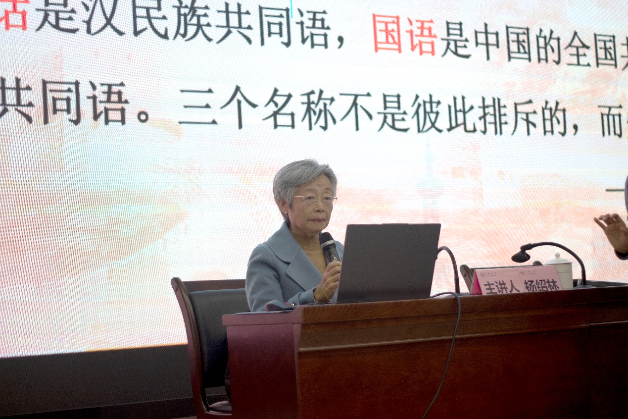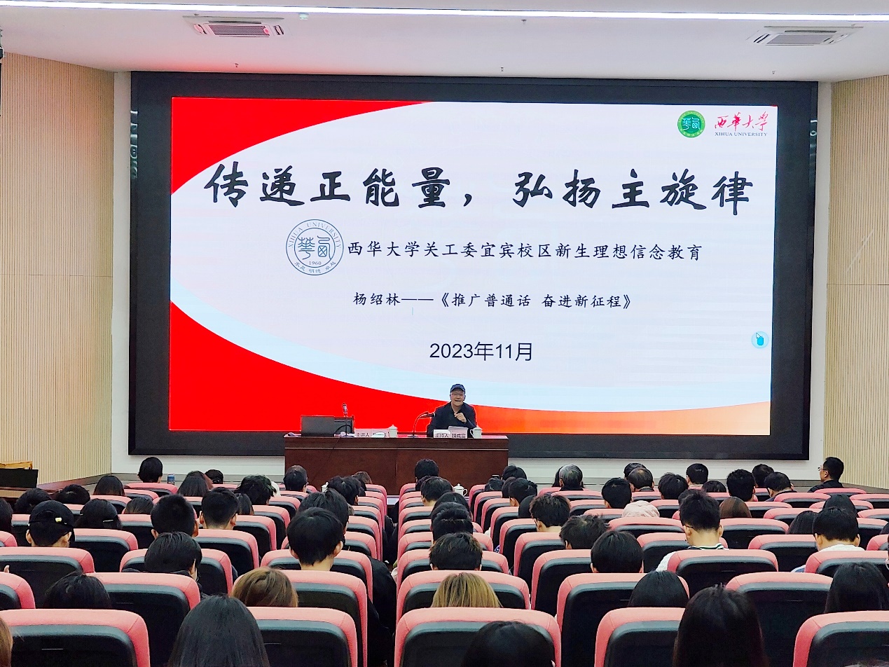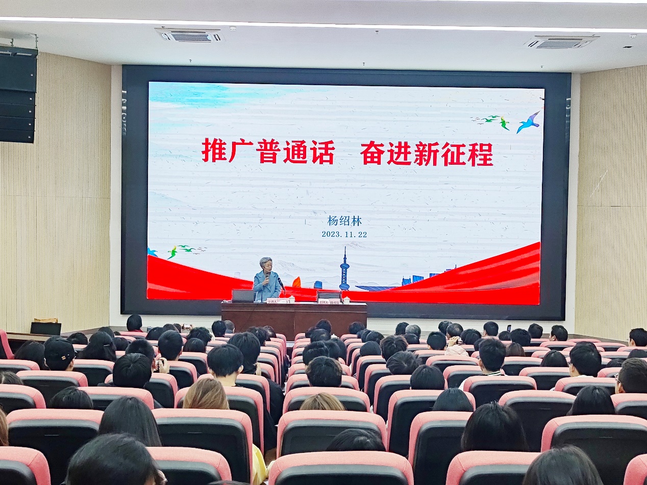 Beat365退休教师杨绍林教授受邀作题为《推广普通话 奋进新征程》的讲座。杨教授以风趣幽默的方式深入浅出地阐述了普通话的历史和演变、我国各地域之间的语系分布状况,以及国家为普及普通话所做的工作。她强调了在全球化背景下,从国家战略层面到学生职业发展,讲好普通话对于大学生至关重要的作用,鼓励学生在大学期间注重语言修养,努力提高普通话水平。杨教授与学生们积极互动,提问、辨音和集体朗诵等环节穿插其中,整个讲座将“‘普’雅言风,‘通’华夏情,‘话’中国梦”的主题贯穿始终。现场掌声、欢笑声不断,新生们不仅拓展了知识面,也明白了学好、讲好普通话的重要意义。