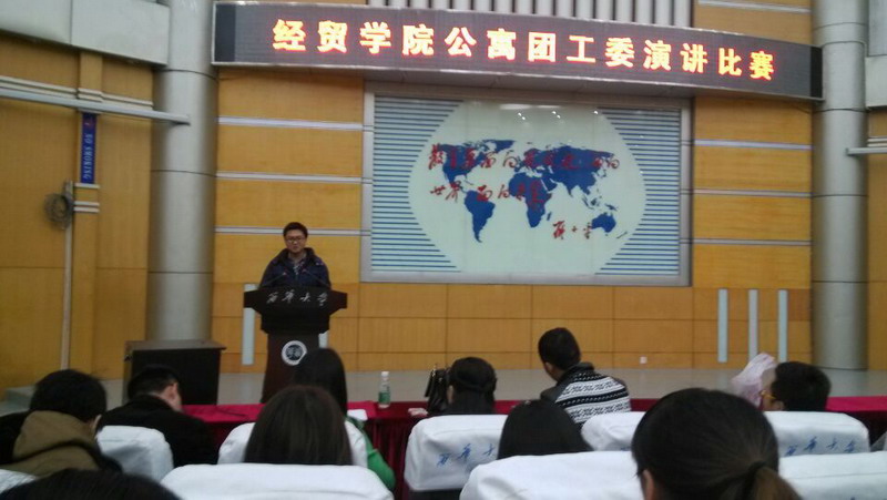 3月20日晚9点,经济与贸易学院公寓团工委“无梦想,不青春”主题演讲比赛在四教报告厅举行。 本次活动旨在提高公寓团工委成员的口语表达能力,给大家提供一个展示自我的舞台。比赛过程中,主持人创新主持风格,全程英语主持;参赛选手的演讲围绕梦想、青春、信仰等主题,语言优美,声情并茂,引起了现场观众的共鸣。 之后,评委们对各位选手的表现进行了点评,并给予了充分的肯定。最终,焦洋同学获得了演讲比赛的一等奖。 据悉,学院公寓团工委将每月开展一次主题活动和竞赛,探索创新更多的活动与培训,力争进一步提升公寓团工委的影响力。