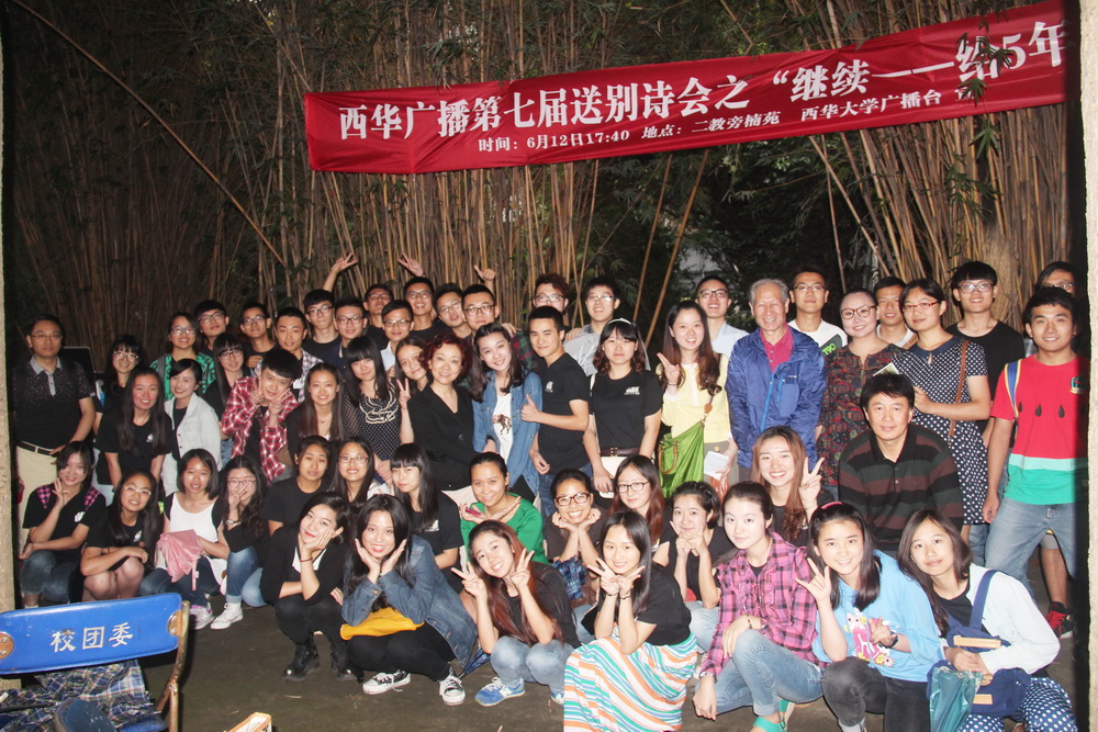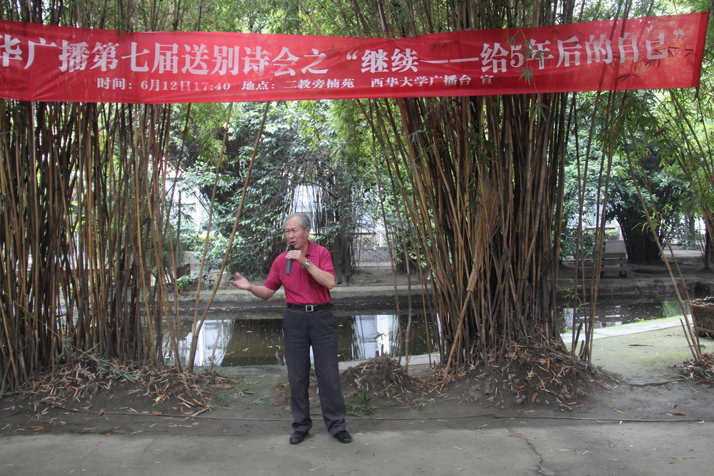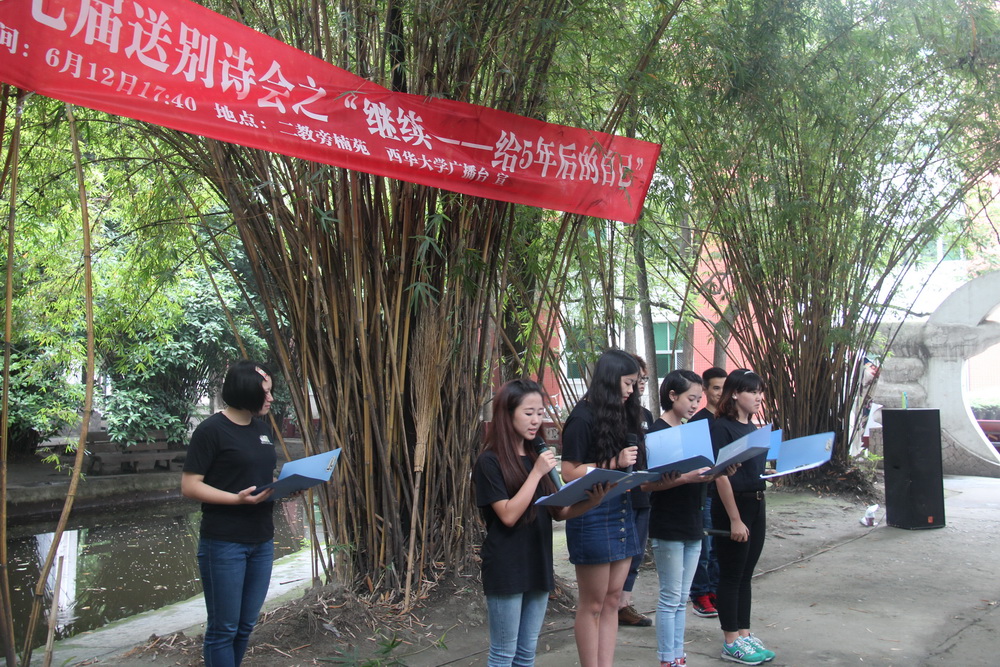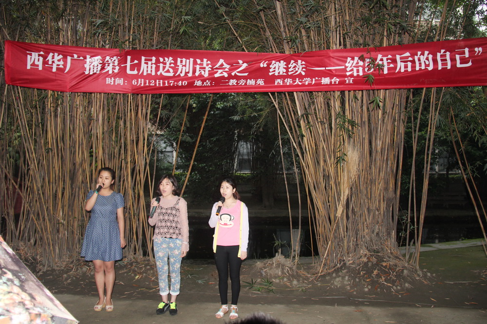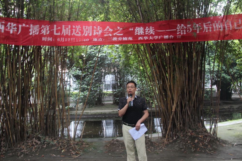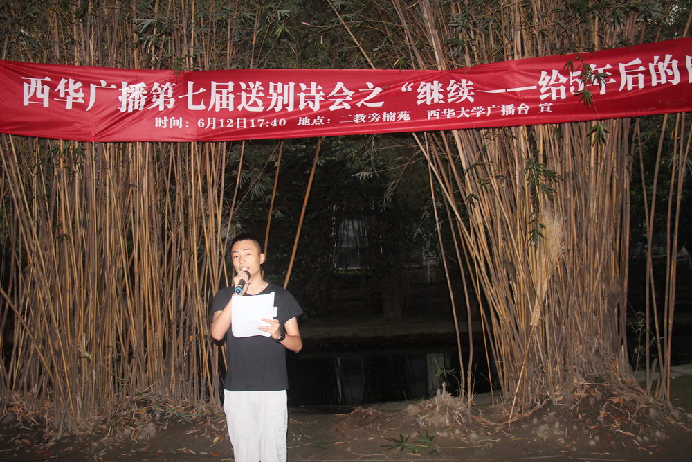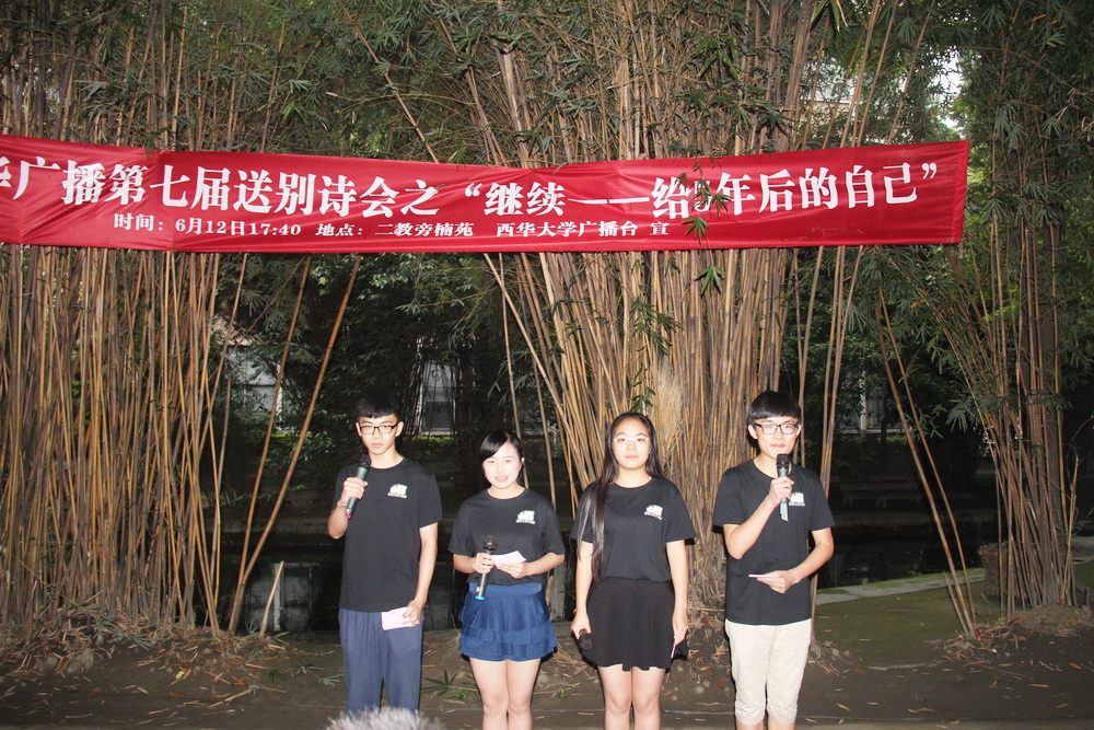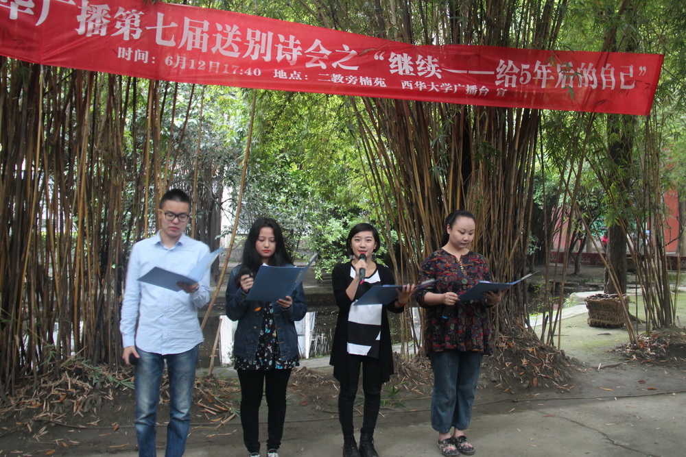 “长亭外,古道边,芳草碧连天,晚风拂柳笛声残,夕阳山外山……”凤凰花开,骊歌响起。6月12日下午6:00 ,二教旁的楠苑中传来阵阵优美的朗诵声,由西华广播台举行的第七届送别诗会在绵绵细雨中拉开了帷幕。此次诗会的主要目的是为了表达对毕业生的祝福,用诗歌抒发毕业生心中不舍的情怀,用诗歌带去师生的美好祝愿!参加此次送别诗会的有党委宣传部老师王蜀苏、夏文光,以及西华广播台的成员和部分毕业生同学。