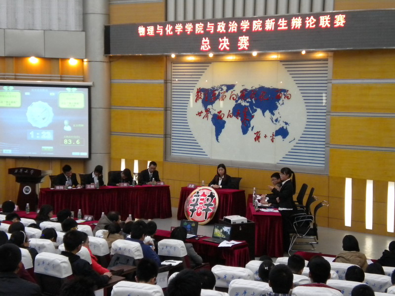 继新生辩论开赛以来,经过多场激烈的论战,物理与化学学院与政治学院联合举办的新生辩论联赛决赛于11月25日晚7:00在四教报告厅举行。政治学院党委副书记黄潇,理化学院2013级新生辅导员王筱莹参加了本次辩论赛。人文学院、交通与汽车工程学院、建筑与土木工程学院、能源与环境学院、材料科学与工程学院辩论队领队担任此了次比赛的评委。