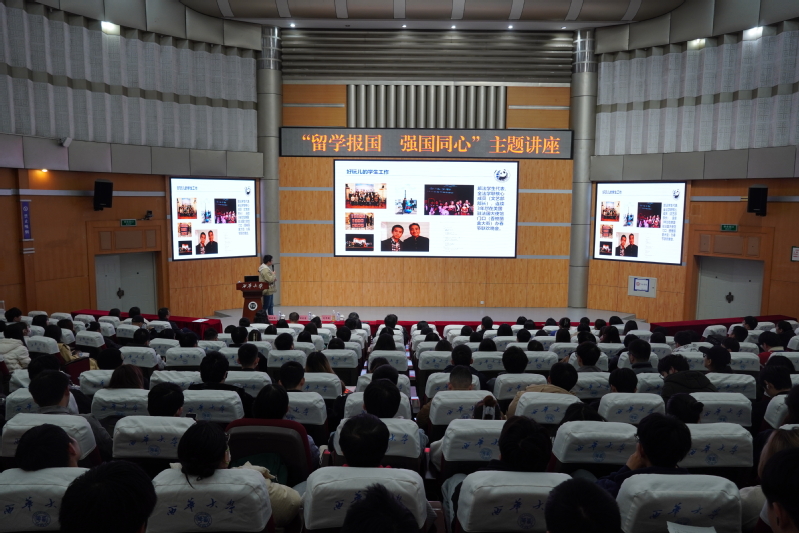 为学习贯彻习近平总书记致欧美同学会成立110周年贺信精神,弘扬留学报国传统,投身强国复兴伟业,助力立德树人根本任务,12月1日,“留学报国,强国同心”主题讲座在四教报告厅举行。本次活动由四川省欧美同学会、致公党四川省直工委联合主办,Beat365唯一官方网站党委统战部、四川省欧美同学会教科委、致公党Beat365唯一官方网站支部、党委学生工作部、党委教师工作部承办。学校海外留学归国教师代表和各学院学生代表共计200余人参加。