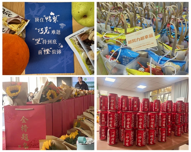 马克思主义学院组织召开考前动员会,并为考研学生准备了“暖心大礼包”。向日葵、橙子、柿子、印有名字的定制可乐和暖贴,寓意着“一举夺魁”“心想事成”“所想皆能如愿”。机械工程学院为考研学子送上考研福袋,内含零食、饮品和励志祝福语,寄托了老师们的深切祝愿。外国语学院毕业班辅导员为考研学子送上“顺利上岸”旺旺加油包,为每人专属定制“一研为定”可乐,两个脆柿寓意“柿柿如意”“好柿成双”,一个“好运常伴”钥匙扣寄托了老师们最真挚的期望。“希望同学们都能够成功上岸,金榜题名,一举夺魁。”外国语学院辅导员罗雨虹说。