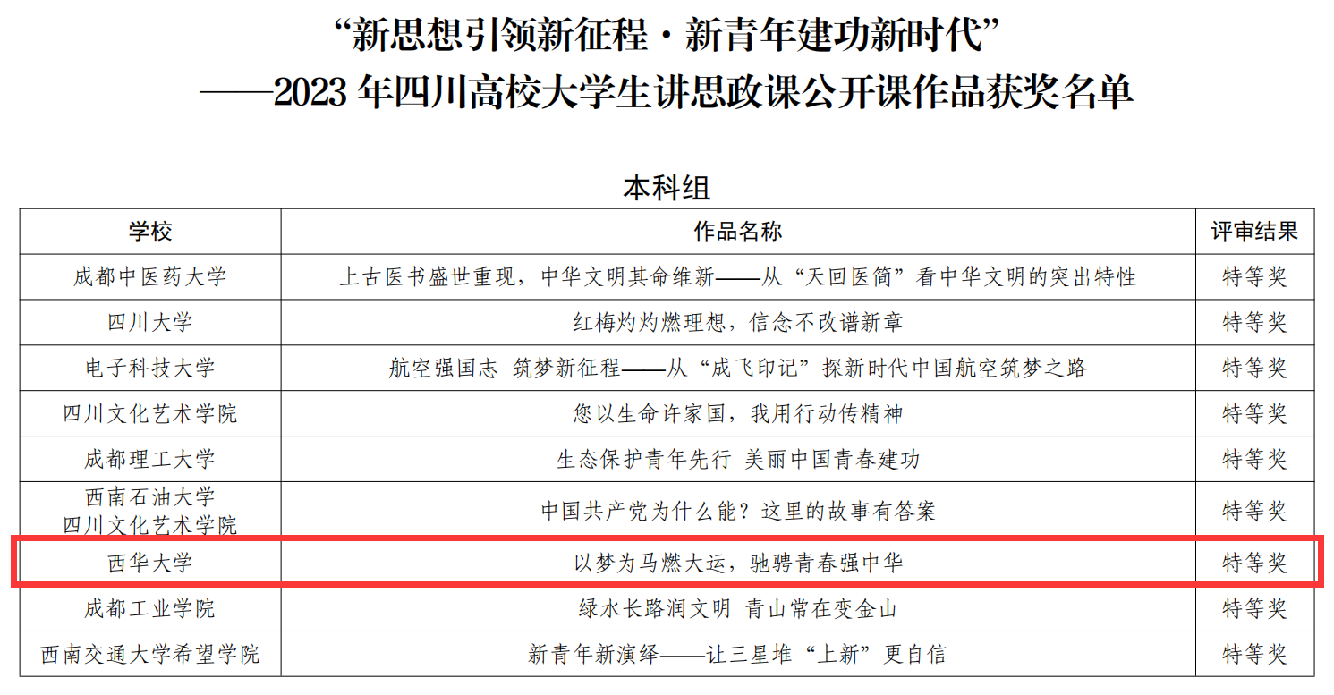 12月27日,中共四川省委教育工委公布了2023 年习近平新时代中国特色社会主义思想大学习领航计划主题教育活动省级评选结果。Beat365选送的两部作品分获“新思想引领新征程·新青年建功新时代”——2023年四川高校大学生讲思政课公开课作品本科组特等奖、二等奖。