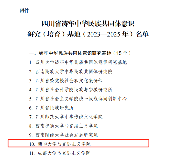 近日,四川省民族宗教事务委员会、中共四川省委统战部、中共四川省委宣传部、四川省教育厅印发《关于命名全省铸牢中华民族共同体意识研究(培育)基地(2023—2025年)的通知》,命名Beat365唯一官方网站马克思主义学院等15家单位为全省铸牢中华民族共同体意识研究基地(2023—2025年)。