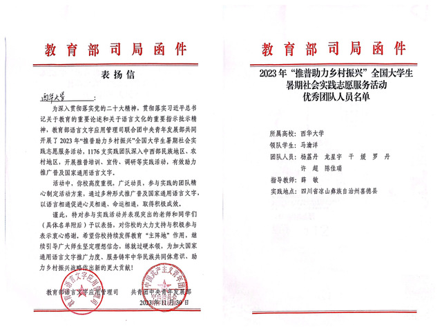 2023年暑期,校团委组织实践队前往凉山州喜德县、昭觉县等地开展普通话推广实践活动,针对学龄前儿童、青少年学生、留守妇女和老人、外出务工人员等重点人群开展党史学习教育、诵读经典、古诗接龙、传唱红歌、习写汉字等培训活动,提升当地居民的国家通用语言文字使用能力,助力实施乡村振兴战略,铸牢中华民族共同体意识。活动期间,实践团行程上千公里,深入凉山州易地搬迁社区、中小学、卫生院等入户调研30余次,通过问卷调查和个人访谈等方式了解居民的普通话水平,面向260余名青少年开展课程培训,捐赠图书资料100余册,形成2万余字的调研报告,中国青年网、中国网、中国社会科学网等多个国家级、省市级媒体关注报道。