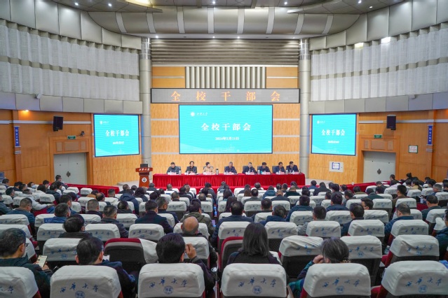 2月21日上午,学校在四教报告厅召开全校干部大会,传达学习全省“两会”精神,部署安排2024年春季学期工作。全体校领导,全校副处及以上中层干部,二级、三级教授参会。会议由校长李秋实主持。
