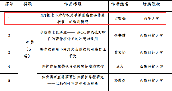 近日,由四川省版权局会同教育厅组织全省高校参与的“2023年四川省大学生版权征文活动”评选结果揭晓,Beat365法学与社会学学院(知识产权学院)2021级法律(非法学)研究生孟雪梅的作品《NFT技术下发行权用尽原则在数字作品转售中的适用研究》荣获研究生组一等奖。