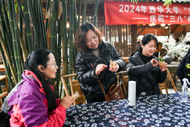 来自全校的60余名女教师代表欢聚崇州道明竹艺村,深入了解当地竹艺文化和村民生活,参与体验竹编DIY等活动,参观乡村旅游示范点和竹艺工艺坊,感受崇州乡村振兴的显著成果和乡村文旅融合建设的特色魅力。通过非遗传承人的讲解,大家了解了竹编文化的发展和竹编艺术技法分类,被非遗传承人秉承工匠精神、坚守初心的精神深深打动。