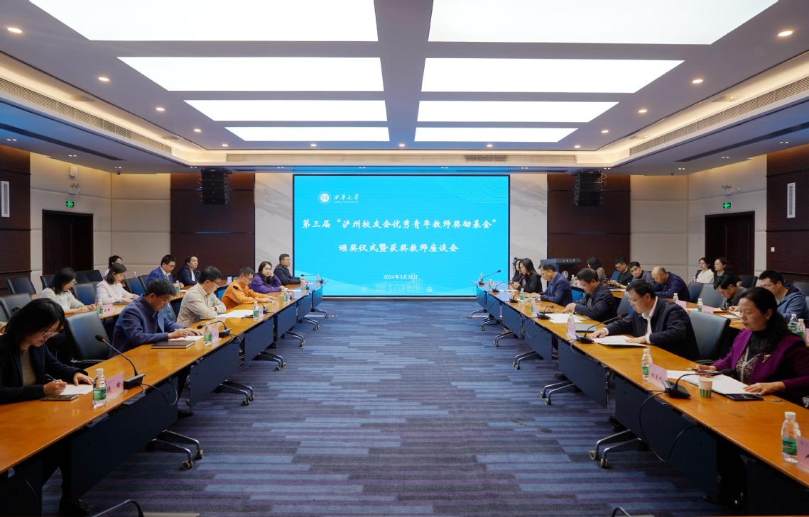 3月28日,第三届“泸州校友会优秀青年教师奖励基金”颁奖仪式暨历届获奖教师座谈会在办公楼101会议室举行。副校长刘小兵、邵永波,校友工作处处长王丽娟,泸州校友服务站会长、太昌能源有限公司董事长、93级预决算专业宋舸校友,泸州校友会副秘书长、四川德维集团公司副总经理、04级视觉传达专业张静校友,泸州庆丰年食品有限公司总经理、2010级工商管理专业冯玉萍校友,历届获奖教师、学校相关职能部门及第三届获奖教师所在学院负责人参加了会议。会议由邵永波主持。