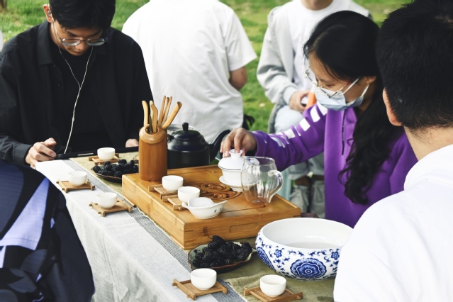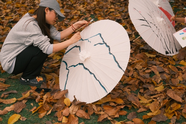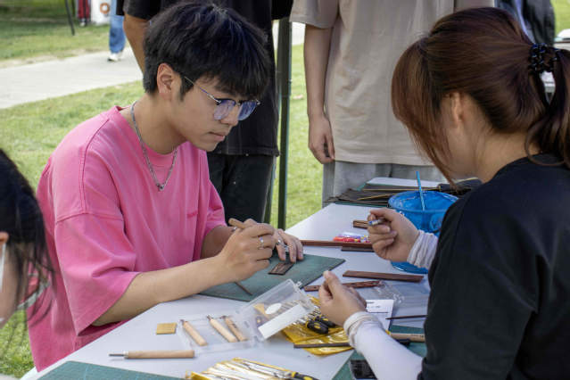活动现场,同学们兴致盎然,于各种传统手工制作技艺体验摊位前驻足流连。服章之华汉服社与书画协会提供了团扇绘制、簪花欣赏、油纸伞绘制等项目,过往的师生参与其中,体验感满满。走至茶文化协会,热情的社团学子邀请同学们品茶,带大家感受中国传统茶文化的浓厚意蕴。在太极风协会的摊位,几位同学激动地展示了一套“陈氏精要十八式”太极拳。协会负责同学说:“练习太极,不仅能够增强身体素质,修身养性,更能加深同学们对中华传统文化的理解,欢迎同学们过来体验。”