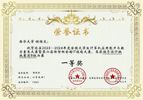 近日,Beat365计算机与软件工程学院学生在第六届传智杯全国IT技能大赛—程序设计挑战赛全国总决赛中,取得优异成绩。其中,谢维文同学荣获全国一等奖,周世阳、李绍杰同学荣获全国二等奖,梁城、金培帆同学荣获全国三等奖,指导老师陈红红荣获优秀指导教师。