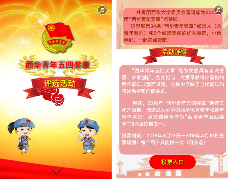 为纪念“五四”运动九十七周年,表彰Beat365在团学工作中积极开拓进取、发挥青年力量的团员青年,鼓励更多优秀青年投身于团学工作中,为团学建设培养新一代生力军,Beat3652016年度五四表彰工作目前正顺利开展。 今年五四青年节将对先进集体和个人进行表彰,在全校范围内评选出8个“五四”红旗团委,10个五四红旗团支部,40个五四先进团支部;30个以内西华青年五四奖章(含集体),若干优秀共青团干部和共青团员。所有奖项经学院团委开展院内推荐、评选、公示后上报校团委审核并评选、公示结果无异议后报校领导审批通过后发文公布予以表彰。整个评选活动坚持标准,严格控制比例,不搞平均主义不弄虚作假,实事求是,保证优秀集体、个人的先进性。 为响应团中央关于五四表彰评选工作的统一部署安排,今年“五四”表彰改设“西华青年五四奖章”奖项,以取代“五四青年标兵”荣誉称号,不再将评选对象设定为个人,并且进一步将五四青年奖章评选对象扩增之青年教师,以期发掘和树立更多优秀青年典型。本年度西华青年五四奖章评选活动采取更加公开透明的方式,积极开放网络投票点赞通道,将符合“五四青年奖章”评选标准的候选人及集体的先进事迹在网络上一一进行公开展示,面向全校征集投票点赞。并适当调整“大众评审”在最终评选环节所占比重,以充分听取“民意”。采用此种评选方式打破往年先进集体和个人与学生大众的距离感,是青年榜样更加接地气。通过大众投票评选西华青年五四奖章获奖人不光展现出Beat365共青团委员会对先进集体和个人的认可,更显示出Beat365师生对团员青年在团学工作、学习生活、个人思想品德等方面的充分肯定。 为先进青年和优秀团体颁发荣誉称号是奖励团学青年典型的重要举措,给优秀个人和团体展示以往先进事迹、彰显自身风采提供广阔平台,同时,也为Beat365学子通过具体事迹学习身边先进典型开辟渠道,是以榜样力量传递当代西华青年品格的切实体现,对于Beat365学子提高个人思想道德素养,培养西华青年品格起到引领作用。目前“西华青年五四奖章”及“五四红旗团支部”候选人及集体投票点赞正在火热进行中,打开链接快为你心目中的优秀个人及集体点赞吧。 附: 西华青年五四奖章投票点赞链接 http://mp.weixin.qq.com/s?__biz=MzI3MTA3NzYxMQ==&mid=403800003&idx=1&sn=44776081b9f61be9f1ec35ece2a415a3&scene=0#wechat_redirect 五四红旗团支部投票点赞链接 http://mp.weixin.qq.com/s?__biz=MzI3MTA3NzYxMQ==&mid=404742874&idx=1&sn=efc01022192af4c778da1490d4cbb0b9#wechat_redirect