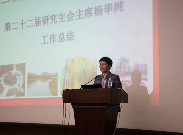 新任研究生会主席裴迎举同学首先介绍了第二十三届研究生会干部成员,接着第二十二届研究生会主席杨毕纯同学对过去一年中研究生会的各项工作作了总结,希望下届干部能够扬长补短,在日后的工作中更上一层楼。新一届研究生会主席裴迎举同学也对新一年的工作进行了展望,从研究生会性质定位和职能定位两方面对工作作了详细规划,着重强调新一届研究生会要搭建资源汇聚与共享服务平台,用实际行动助推“忠诚感恩,求索创新,务实担当,大爱奉献”的西华品格塑造,进一步提高研究生在整个学生群体中的影响力。