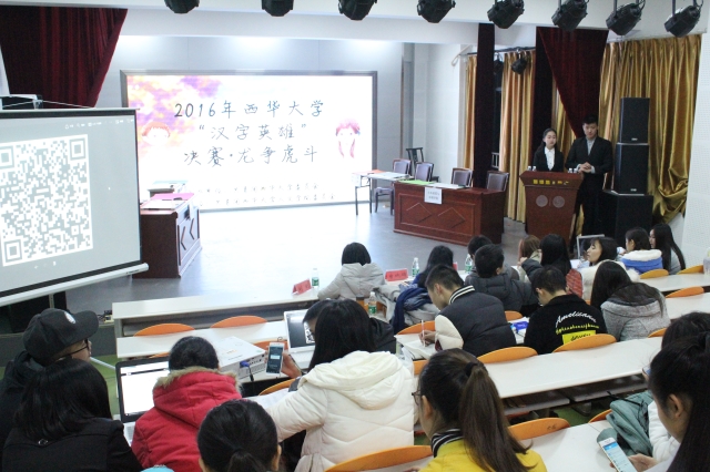 为给西华学子打造一个读懂汉字、写好汉字、展示汉字掌握水平的舞台,由校团委主办、人文学院承办的第四届汉字英雄大赛决赛于12月4日晚上7:00在凤凰学院小剧场6D—305顺利举行。出席并担任本次大赛的评委分别是人文学院中文系曾晓娟老师、王燕飞老师以及电气与电子信息学院刘钊老师。本次比赛共有8个学院代表队参加,人文学院团委部分学生干部出席了本次比赛。主持人由人文学院孙涵和廖子瑜担任。
