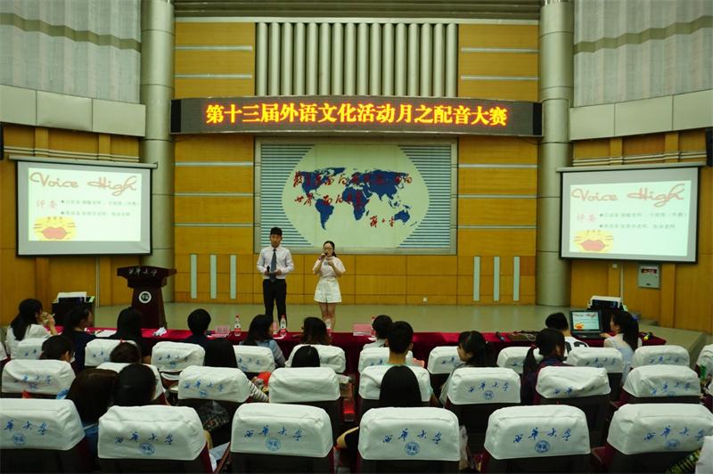 | 5月10日19:00,Beat365唯一官方网站第十三届外语文化活动月之英、日语配音大赛决赛在四教报告厅举行。外国语学院英语系张智华、张诗老师及日语系谢敏、外教守部贤老师共同担任专业评委,与此同时还有二十位大众评审。来自全校各学院的同学共享了这场外语与影视文化激情碰撞的盛宴。 在本次比赛中,各组选手的自我介绍在配音尚未开始时便赚足眼球,搞怪逗乐样样拿手,一口流利的英语或日语秀到满场鼓掌。配音内容有美国动画电影《里约大冒险2》、《冰河世纪》;有日本动画电影《狼的孩子雨和雪》;有美国经典情景喜剧片《Friends》等等,更有日语版《甄嬛传》,熟悉的场景配上独特的日语对白,引得全场观众连连拍手大笑。很多选手自然流畅宛如电影原版一般的配音让观众发出阵阵赞叹。 最后,经过激烈的角逐,罗宇豪等同学组成的第四组以《冰河世纪》的配音摘得一等奖的桂冠;李秋霞等同学组成的第八组以《甄嬛传》的配音夺得二等奖;饶国正等同学组成的第一组以《蓝精灵》的配音获得三等奖。第三组刘思汉以《疯狂原始人》的配音和第五组杨赵同学以《狼的孩子雨和雪》的配音赢得优秀奖。至此,第十三届外语文化活动月之英语、日语配音大赛完美落幕。