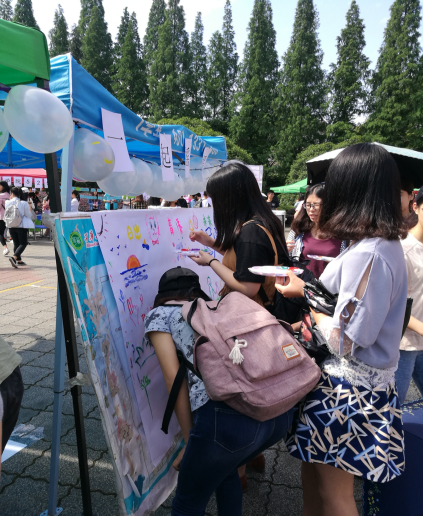 此次活动包含了“勾画未来”、“一起摇摆”两个项目,旨在引发大学生关注自我身心健康发展,引导大学生树立正确人生目标,做一个积极乐观、健康向上的追梦人。“勾画未来”活动为同学们提供了“日出”、“青春”、“未来”三个主题词,同学们利用彩色颜料,用手指在展板上勾画出自己对三个主题词的第一印象;“一起摇摆”则是带领同学们一起跳健康操,欢快的节奏可以舒缓心理压力,体现出大学生们青春洋溢的风采。