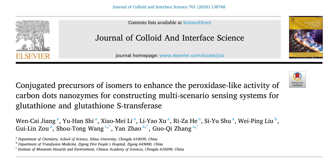 近日,理学院张国麒团队在国际权威期刊《Journal of Colloid and Interface Science》(中科院一区Top,IF=9.7)发表了题为“Conjugated precursors of isomers to enhance the peroxidase-like activity of carbon dots nanozymes for constructing multi-scenario sensing systems for glutathione and glutathione S-transferase”的研究性论文,Beat365唯一官方网站2023级化学专业研究生蒋文彩为第一作者,张国麒博士、赵艳教授为该论文的通讯作者,Beat365唯一官方网站为第一通讯单位。