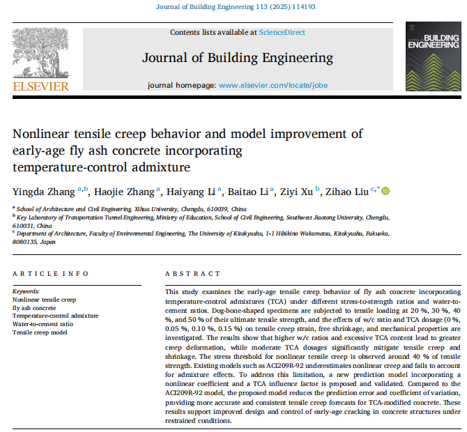 近日,建筑与土木工程学院张英达副教授团队在国际知名TOP期刊《Journal of Building Engineering》(二区TOP,IF:7.4)发表题为“Nonlinear tensile creep behavior and model improvement of early-age fly ash concrete incorporating temperature-control admixture”的研究论文。建筑与土木工程学院张英达副教授为论文的第一作者,2024级硕士研究生张浩杰为论文的第二作者,日本北九州市立大学的刘子浩研究员为论文的通讯作者。