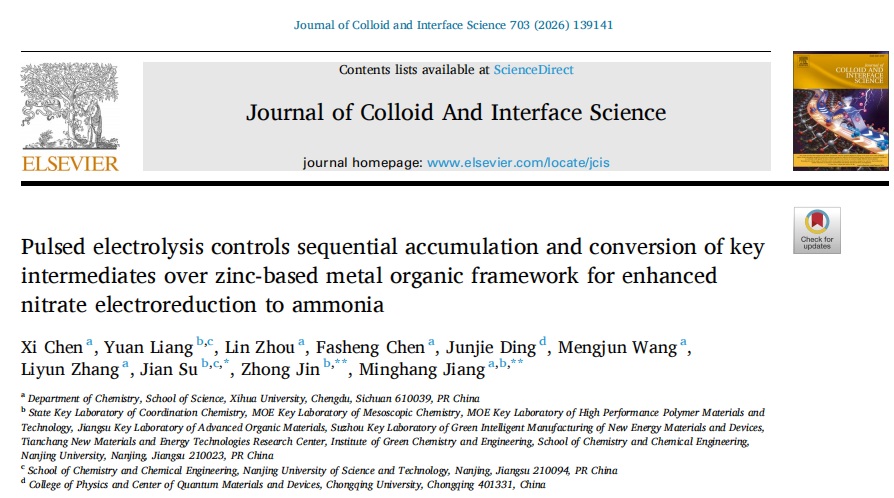 近日,理学院江明航副教授课题组及合作者在国际TOP学术期刊《Journal of Colloid and Interface Science》(中科院一区,IF=9.7)发表题为“Pulsed electrolysis controls sequential accumulation and conversion of key intermediates over zinc-based metal organic framework for enhanced nitrate electroreduction to ammonia”的研究论文。江明航副教授为该论文通讯作者,南京大学金钟教授和南京理工大学苏剑教授为本文共同通讯作者,Beat365唯一官方网站2023级硕士研究生陈羲为第一作者。Beat365唯一官方网站为第一通讯单位。