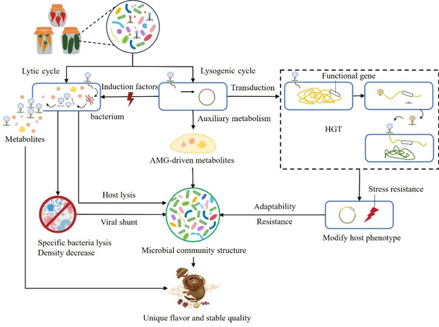 Figure 2. Impacts of phages with different life cycles on vegetable fermentation processes (Virulent phages lyse host cells to release intracellular components, directly contributing to substrate transformation. The viral shunt regulates population densities of dominant species to maintain biodiversity. In contrast, temperate phages exert their effects via: (a) integration of AMGs into host metabolic networks to enhance metabolic capacity and optimize flavor compound synthesis; (b) HGT mediating the dissemination of virulence factors, antibiotic resistance genes, and environmental adaptation genes (e.g., acid tolerance genes) among microorganisms. This process confers novel functional traits to hosts, significantly improves their niche adaptation capabilities, and is a key driver of microbial community evolution. Collectively, these phage-host interactions maintain the dynamic equilibrium of microbial communities).