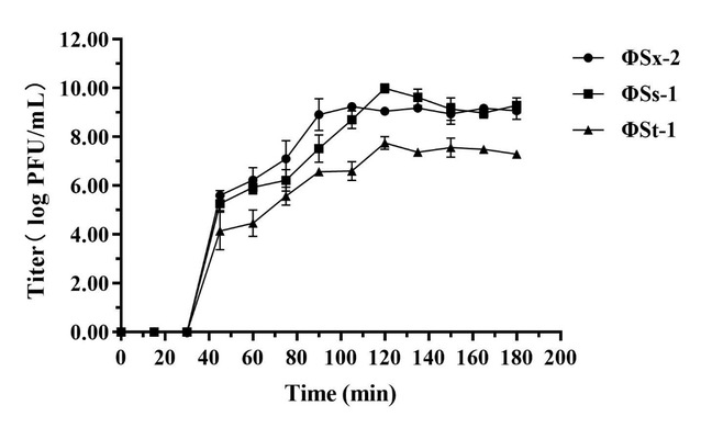 Figure 2. The one-step growth curves of phages ΦSx-2, ΦSs-1, and ΦSs-2 infecting their host bacteria in TSA medium (Circle: Growth curve of ΦSx-2; Square: Growth curve of ΦSs-1; Triangle: Growth curve of ΦSs-2). The values shown in the figures are the averages of three experiments.
