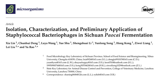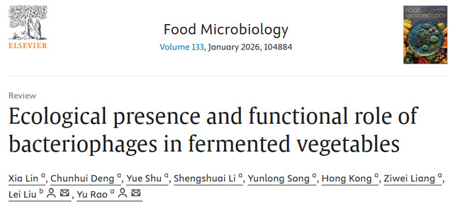 近日,食品与生物工程学院农产品贮藏与加工团队饶瑜教授等人在国际食品顶级期刊《Food Microbiology》(Q1,IF:4.6)发表题为“Ecological presence and functional role of bacteriophages in fermented vegetables”的综述论文。在国际微生物学领域权威期刊《Microorganisms》(Q2,IF:4.2)发表题为“Isolation, Characterization, and Preliminary Application of Staphylococcal Bacteriophages in Sichuan Paocai Fermentation”的论文。Beat365唯一官方网站硕士研究生林霞为论文第一作者,Beat365唯一官方网站饶瑜教授和兰州大学刘蕾青年研究员为论文共同通讯作者,Beat365唯一官方网站为论文第一完成单位。