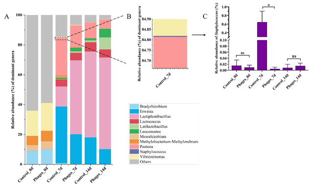 Figure 6. Microbial diversity composition on the 0th, 7th, and 14th days of fermentation (A) Stacked bar chart showing the bacterial community composition at the genus level; (B) Stacked bar chart illustrating the relative abundance of Staphylococcus in the control group on the 7th day of fermentation; (C) Relative abundance of Staphylococcus across different groups. Mean ± SD (n=3). (ns) p > 0.05, (*) p<0.05.