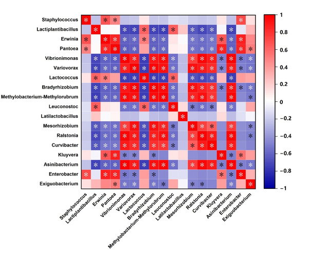 Figure 7. The correlation matrix mainly belongs to Spearman's rank correlation between attributes. (*) p<0.05.