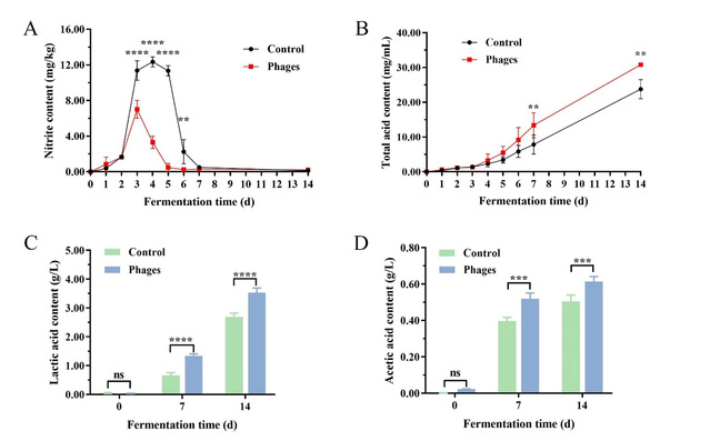 Figure 8. Changes in the contents of nitrite (A), total acid (B), lactic acid (C), and acetic acid (D) during the fermentation process of paocai. Data are expressed as Mean ± SD (n=3), (ns) p > 0.05, (*) p<0.05, (**) p<0.01, (***) p<0.001, (****) p < 0.0001.