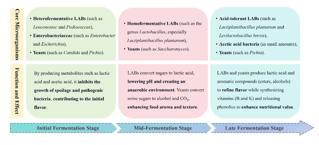 Figure 1. Core microbial types and their functional roles at each stage of the vegetable fermentation process.
