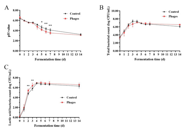 Figure 4. Changes in pH (A), total viable bacteria count (B), and lactic acid bacteria count (C) during the fermentation process of paocai (Control: paocai group without artificial inoculation of phages; Phages: paocai group with artificial inoculation of phages ΦSx-2, ΦSs-1, and ΦSs-2). Data are expressed as Mean ± SD (n=3). (*) p<0.05, (**) p<0.01.