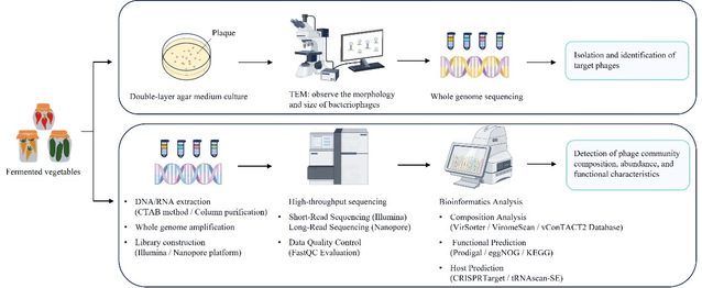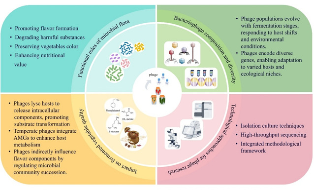 本综述系统总结了微生物群落在蔬菜发酵过程中的核心机制作用。在此基础上,文章探讨了发酵蔬菜生态系统中噬菌体群落的多样性特征和生态功能,重点阐述了噬菌体通过“裂解-溶原”转换调控发酵微生物群落动态的分子机制。此外,本文全面归纳了包括噬菌体分离培养、基因组分析和功能表征在内的关键技术体系,为建立噬菌体资源库及开发基于噬菌体的发酵蔬菜调控技术提供了有价值的参考。