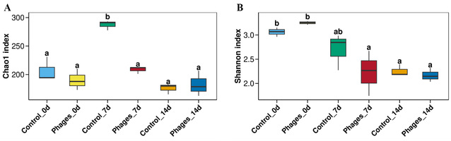 Figure 5. Temporal changes in alpha diversity indices during paocai fermentation. (A) Chao1 index showing community richness; (B) Shannon index indicating community diversity. Error bars represent standard deviations of triplicate biological replicates(n=3).